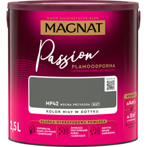 MAGNAT Passion to farba lateksowa o plamoodpornych i hydrofobowych właściwościach. Gładka i matowa powłoka farby podkreśla głębię koloru i sprawia, że pomalowane ściany są wyjątkowo miłe w dotyku.