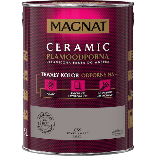 MAGNAT Ceramic to ceramiczna farba do wnętrz bazująca na ceramicznych komponentach oraz najwyższej jakości żywicach i pigmentach. Ta unikalna formuła zapewnia farbie MAGNAT trwały kolor odporny na: plamy, zmywanie i szorowanie oraz intensywne użytkowanie .