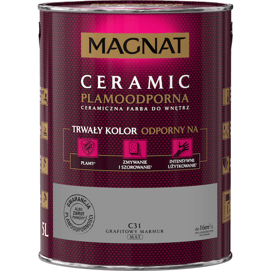 MAGNAT Ceramic to ceramiczna farba do wnętrz bazująca na ceramicznych komponentach oraz najwyższej jakości żywicach i pigmentach. Ta unikalna formuła zapewnia farbie MAGNAT trwały kolor odporny na: plamy, zmywanie i szorowanie oraz intensywne użytkowanie .