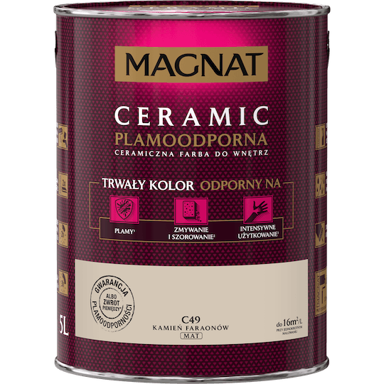 MAGNAT Ceramic to ceramiczna farba do wnętrz bazująca na ceramicznych komponentach oraz najwyższej jakości żywicach i pigmentach. Ta unikalna formuła zapewnia farbie MAGNAT trwały kolor odporny na: plamy, zmywanie i szorowanie oraz intensywne użytkowanie .