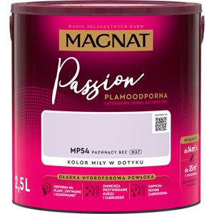 MAGNAT Passion to farba lateksowa o plamoodpornych i hydrofobowych właściwościach. Gładka i matowa powłoka farby podkreśla głębię koloru i sprawia, że pomalowane ściany są wyjątkowo miłe w dotyku.
