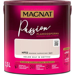 MAGNAT Passion to farba lateksowa o plamoodpornych i hydrofobowych właściwościach. Gładka i matowa powłoka farby podkreśla głębię koloru i sprawia, że pomalowane ściany są wyjątkowo miłe w dotyku.