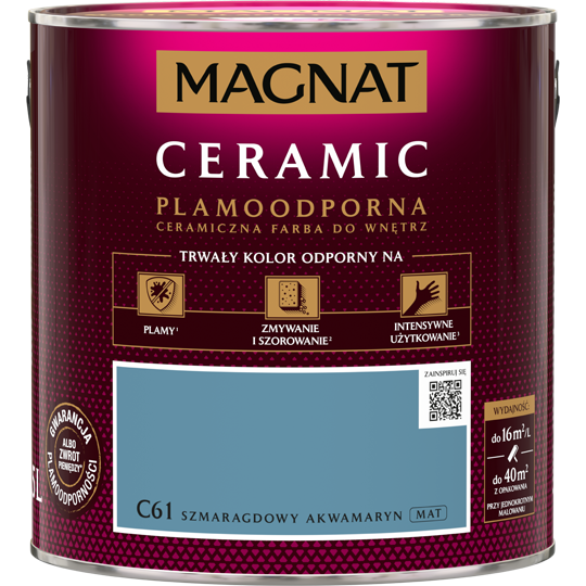 MAGNAT Ceramic to ceramiczna farba do wnętrz bazująca na ceramicznych komponentach oraz najwyższej jakości żywicach i pigmentach. Ta unikalna formuła zapewnia farbie MAGNAT trwały kolor odporny na: plamy, zmywanie i szorowanie oraz intensywne użytkowanie .