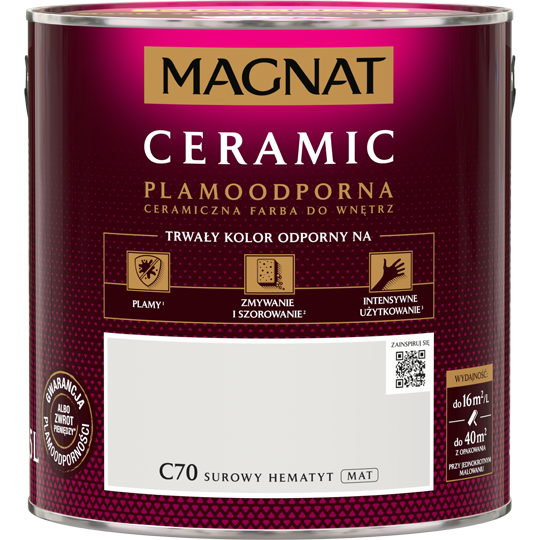 MAGNAT Ceramic to ceramiczna farba do wnętrz bazująca na ceramicznych komponentach oraz najwyższej jakości żywicach i pigmentach. Ta unikalna formuła zapewnia farbie MAGNAT trwały kolor odporny na: plamy, zmywanie i szorowanie oraz intensywne użytkowanie .