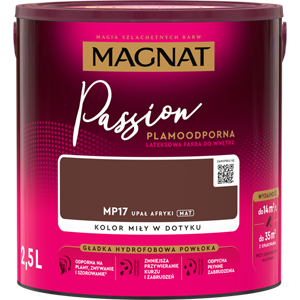 MAGNAT Passion to farba lateksowa o plamoodpornych i hydrofobowych właściwościach. Gładka i matowa powłoka farby podkreśla głębię koloru i sprawia, że pomalowane ściany są wyjątkowo miłe w dotyku.