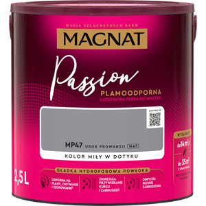 MAGNAT Passion to farba lateksowa o plamoodpornych i hydrofobowych właściwościach. Gładka i matowa powłoka farby podkreśla głębię koloru i sprawia, że pomalowane ściany są wyjątkowo miłe w dotyku.